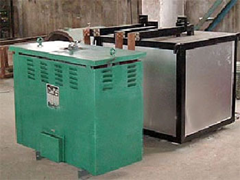 DM型三相埋入电极盐浴炉系长方形结构,外壳由角钢及钢板焊成,内放钢板制成的内胆,内胆中是采用立砖 及标准砖组成的盐槽,内胆主要是用于防止熔盐渗入保温层及盐槽外,当盐槽损坏时便于吊出修理。内胆与炉壳 之间砌有保温砖及填满保温粉,电极是埋在盐槽底部,一个面接触浴盐,其余三个面埋在耐火砖中,每块电极有 铜板连接,铜板从盐槽顶部探出,并与变压器连接形成回路。此结构彻底解决了渗漏问题,由于电极离槽底毫米 ,这样可避免由于炉渣沉积而造成两电极短路。在很大程度上延长了炉体与电极的使用寿命。